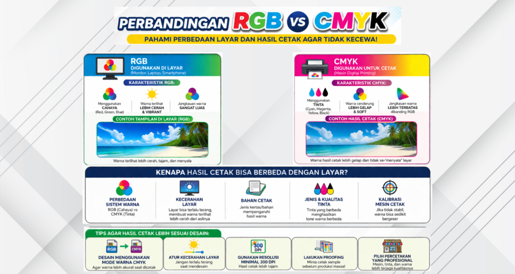 Padahal, perbedaan ini adalah hal yang wajar dalam dunia digital printing. Layar dan mesin cetak bekerja dengan sistem warna yang berbeda, sehingga hasil akhirnya pun bisa berbeda.